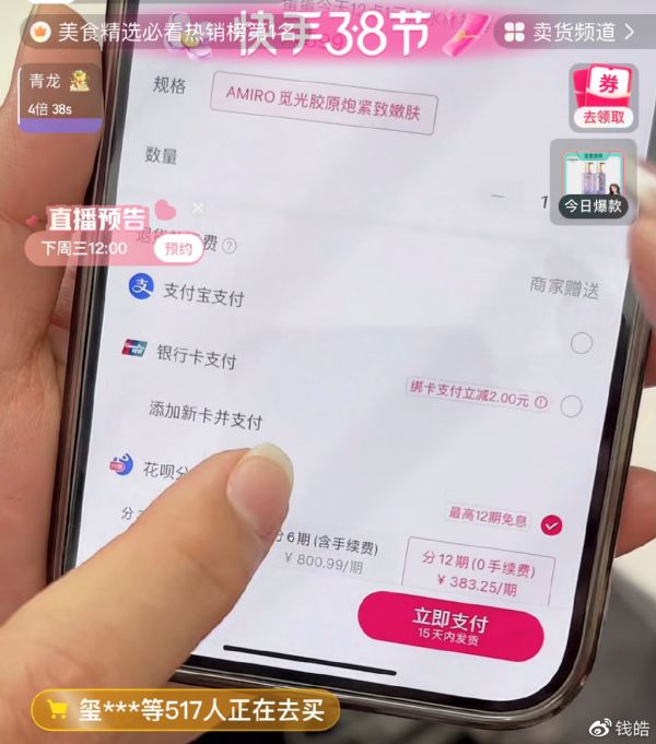38大促期间,从每家都要“硬刚”的Apple,到潮流的家用美容仪,快手上大量的高客单商品都可享受花呗分期免息优惠。在用户支付时共有4种免息期数可选,分别是3期、6期、12期和24期。