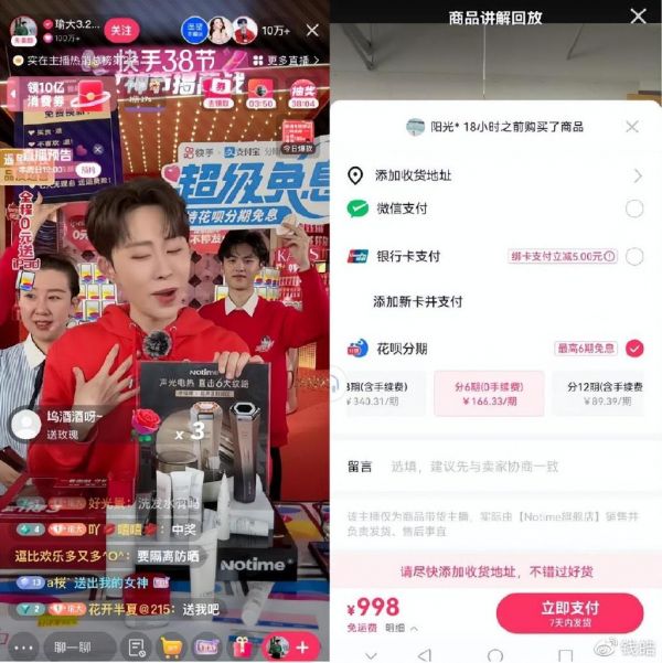 当然作为电商赛道的新玩家,直播电商在往成熟化发展的过程中,平台和商家对分期免息也有着进阶需求。笔者观察到,今年的38大促,分期免息玩法就被更多的平台商家、主播叠加进了补贴中。怎么做的呢?