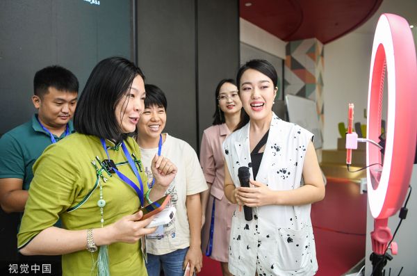 2022年7月4日,海口复兴城海南自贸港网红孵化基地,100名旅行社行业工作人员组成“旅游体验官”在此进行短视频拍摄及直播技能专业培训。视觉中国 图