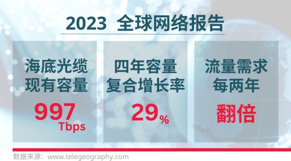 2017年至2021年间,许多主要路由的带宽增长率超过2倍;全球光缆总带宽目前约为 997 Tbps,4年的复合年增长率(CAGR)为 29%。原因当然是国际流量使用呈现爆发式的增长,几乎每两年就增加一倍的数据流量,如果没有新光缆的支持全世界的数字化服务都将陷入困境。