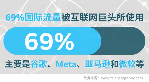 谁使用了最多国际流量呢?你可能猜到,就是谷歌、Meta、亚马逊和微软等互联网巨头,统计显示他们在2021年使用了多达 69%的国际带宽,为此巨头们更加积极地投资海缆基础建设的并自行运维部分海缆,以减轻流量成本。