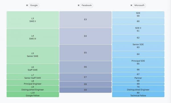 他说:“谷歌和 Facebook 的职级设置最为相似”。
