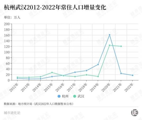 不同于杭州一度收紧,武汉专科落户的政策延续,在2020年、2021年连续两年实现人口超百万的增长。若按住建部公布的《2021年城市建设统计年鉴》,武汉2021年城区常住人口1093.84万人,已达到超大城市标准,同期杭州为993.18万人,距离超大城市尚有差距。