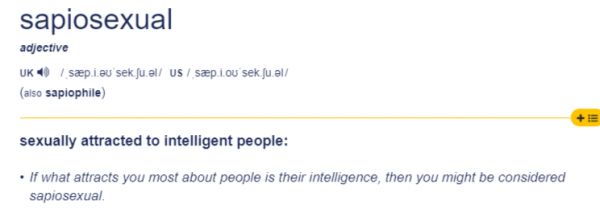 英文来源于拉丁文中的 sapiens( 辨别,理解),词典上对它的定义是这样的:相比于外表,更容易被智商和精神特质吸引(专指性吸引力)。