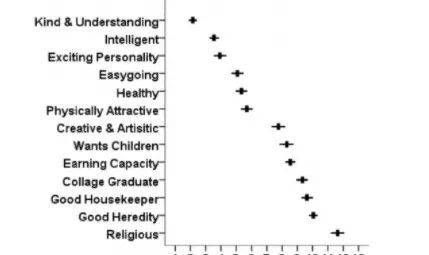 他们在这个研究里找了来自 33 个国家的近 10000 个参与者做了统计,发现“智力”在择偶标准中位居前二,仅次于“待人友善、善解人意”,颜值居然才排到第 6 位(看来大家也没有想象中那么“看脸”)。