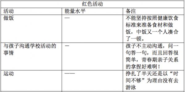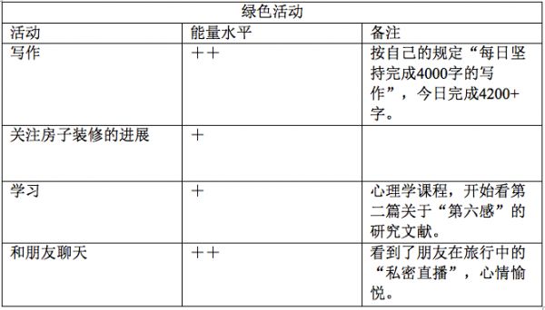 本周我们教授布置的作业中有一项叫“红绿活动”,每天记录自己做的事,绿色代表我们可以依靠自己的优势、不怎么费精神能量就能完成、乐此不疲的事;红色代表涉及我们的弱点、消耗精神能量较大、比较费心费力才能完成的事。