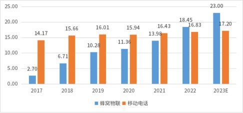图|2017-2023年蜂窝物联和移动电话数(亿户)数据来源:工信部