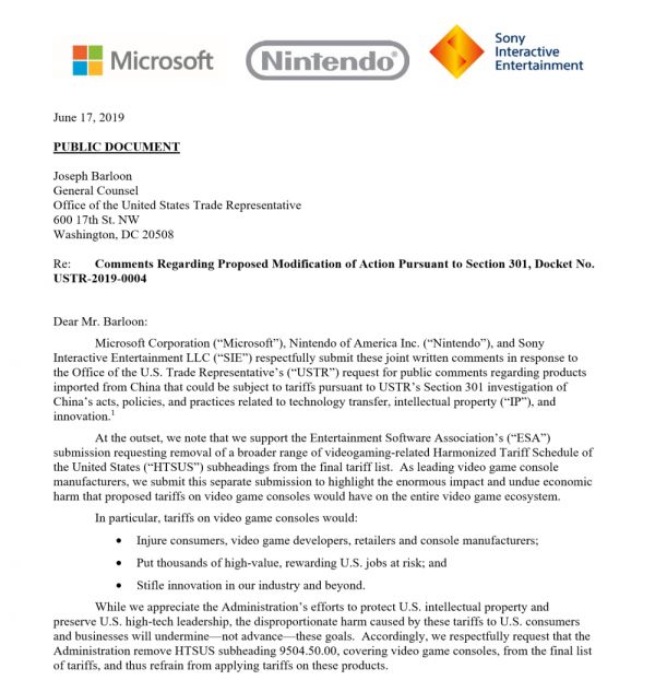 @机核【微软、任天堂和索尼联名反对美国政府在贸易战中对游戏机征收25%关税】6月26日早些时候,一份来自微软、任天堂和索尼的联合声明在网上被泄露。这是一份提交给美国贸易代表办公室的文件,在7页内容中,三家主机生产商共同表示:最近美国政府对中国生产的游戏机征收25%关税的行为将严重损伤游戏产业的发展。
