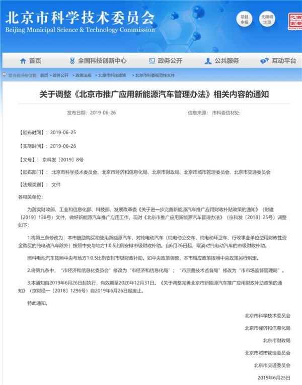 @IT之家【6月26日起,北京取消纯电动汽车市级财政补助】北京市科委、市经信局、市财政局、市城管委、市交通委6月26日发出关于调整《北京市推广应用新能源汽车管理办法》相关内容的通知,宣布取消对纯电动汽车的市级财政补助。本通知自今年6月26日起执行,有效期至2020年12月31日。