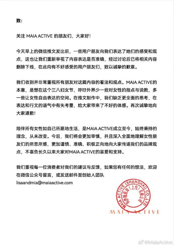 MAIA ACTIVE联合创始人兼CEO王佳音在傍晚发布的那封致歉推文中写道:“我尚未想通隐约意识到,我们糟糕表达的背后或许藏着我们某种‘傲慢’,以及对众多仍处在男权社会被隐性或显性剥削的女性的同理心和共情的缺乏。我们应该更好地洞察你需要什么,而不是武断自负地告诉你该做什么。”