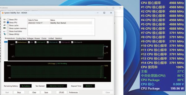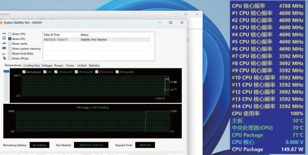 不过我们发现一些主板对于“充分释放处理器的性能”这一点却不能保证,而且用户买回去只要合理地通过软件测试就能很快地检测出来。如我们测试中的这款主板在使用酷睿i5-13600K时,运行AIDA64 FPU烤机测试时,刚开始烤机时的大核心P Core工作频率为4988MHz,小核心E Core核心频率为3791MHz,CPU封装功耗为199.96W,还小幅超过了酷睿i5-13600K的官标睿频TDP:181W,一切看起来比较正常。但仅在烤机1分20秒,在处理器温度没有碰到100℃温度墙,也没有出现处理器过热保护时,处理器的工作频率与处理器封装功耗居然出现了莫名其妙地大幅下降。其P Core频率降至4690MHz左右,E Core核心频率降至3592MHz左右,CPU封装功耗则降至仅仅149.87W。