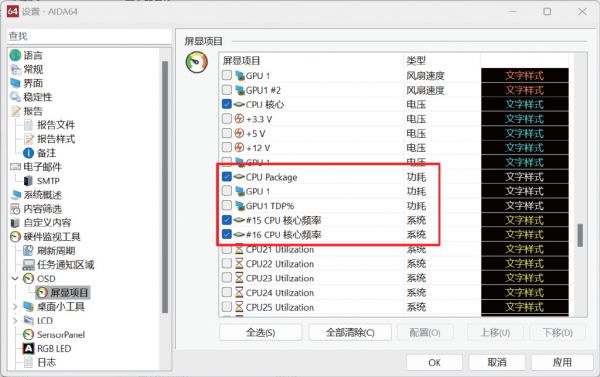 在屏显项目中,一定要勾选CPU频率与CPU PACKAGE(封装)功耗。