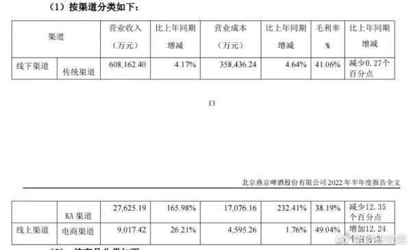 往期审视,燕京啤酒销售对线下渠道存在高度依赖。以2022年中报为例,公司期内线下渠道营收总计63.58亿元。其中传统渠道收入60.82亿元,KA渠道营收2.76亿元。线上渠道营收仅9017.42万元。