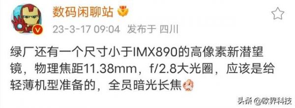 今日,博主@数码闲聊站爆料“绿厂还有一个尺寸小于IMX890的高像素新潜望镜,物理焦距11.38mm,f/2.8大光圈,应该是给轻薄机型准备的,全员暗光长焦”爆料中的“绿厂”指的是OPPO,旗下的轻薄机型为OPPO Reno系列,该爆料的影像参数或属于OPPO Reno10 Pro+。