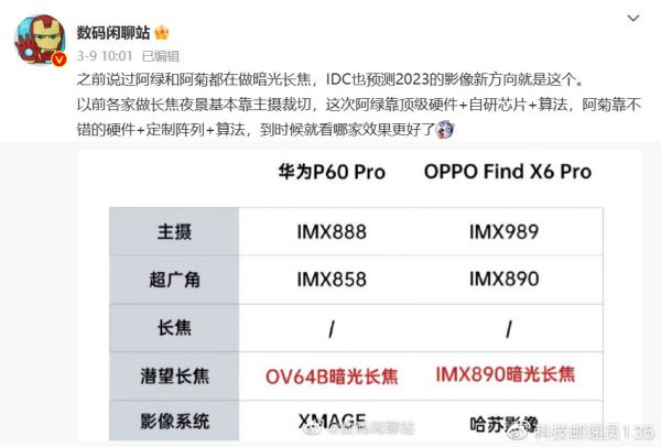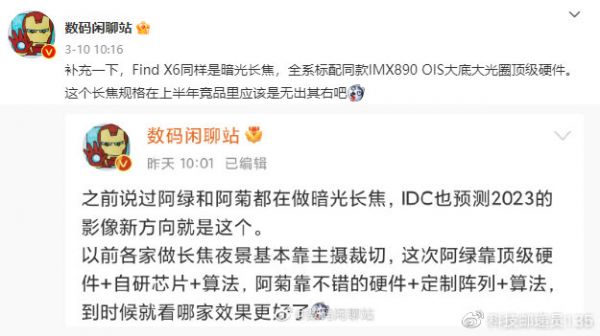 据悉,OPPO Find X6 Pro的潜望长焦是IMX890,靠着顶级硬件+自研芯片+算法达成暗光长焦。并且身为“中杯”的Find X6也有暗光长焦技术,传感器还是IMX890。这下两家厂商算是彻底碰起来了呀。