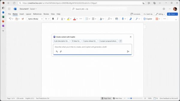 Word 中的 Copilot :与人们一起工作,进行写作、编辑、总结和创作。