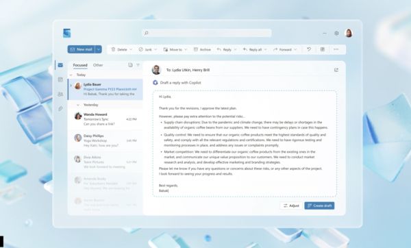 Outlook中的Copilot可以帮用户完成电子邮件分类,总结多人、冗长、复杂的电子邮件线程,甚至可以归纳总结邮件中的话题内容。还可以将关键词或草稿转写为正式的邮件或消息。