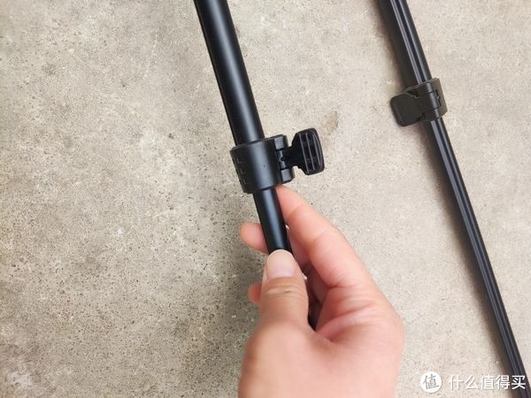 三脚架全部打开有1米8左右,可以根据需要伸缩,一共可以伸缩三次。打开这个卡扣就可以伸缩,调试好高度之后按下去,固定的非常好。