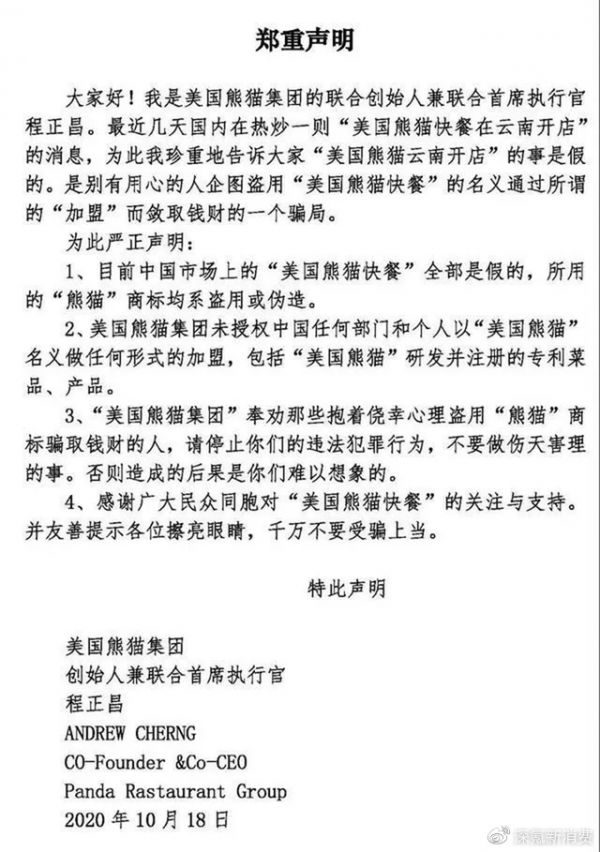 当年10月,一家名为“熊猫餐厅”的店铺在云南昆明开业,此举被视作美国熊猫快餐回国,制造了不少热度的同时,也吸引了许多游客慕名打卡。尽管在这之后,熊猫快餐借中国烹饪协会官方网站发布声明称,该店并非官方所开,但关于海外中式餐馆回国的问题也引发了讨论。
