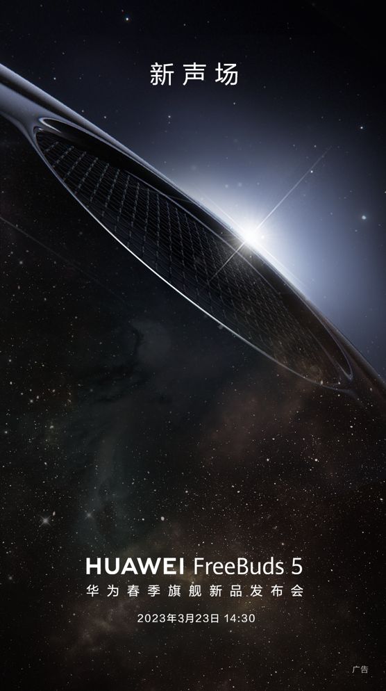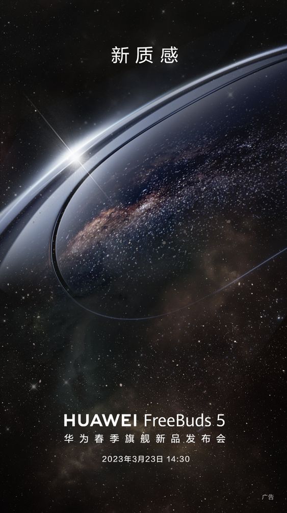 在这一张海报中,以“新质感”为主文案,画面中心则像是放大了的发声单元,并有反射光线的效果。这让人想到了华为FreeBuds 5采用全新材料的可能。或许这种全新的材料会带来更高的品质,结合水滴造型与机身的流畅曲线,半入耳设计会进一步提升佩戴舒适度体验。