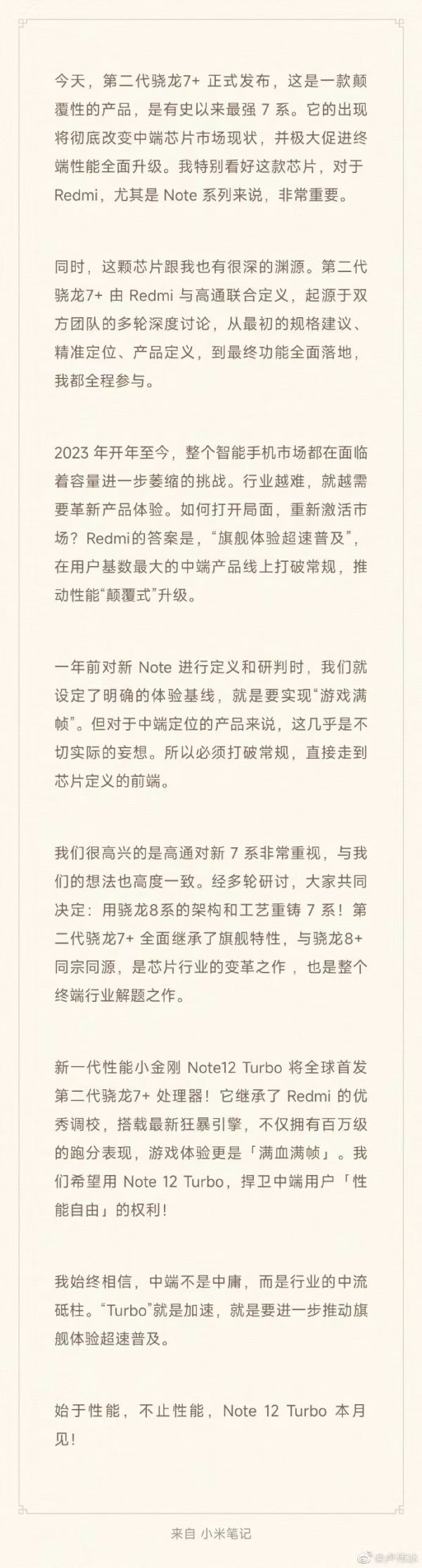目前中高端手机都处于瓶颈期,卢伟冰能超前的看到未来方向也预示着手机行业又要迎来改变。卢伟博:行业越难,就需要革新产品体验。卢总说的很对,当行业都在停滞吃老本的时候,就需要用于创新和改变目前市场平庸的问题。高通骁龙这次和Redmi 联合调教的骁龙7+也就意味着这一困境要被瓦解迎来全新的方向。Redmi Note 12Turbo我觉得可以很好的把大环境改变一次了。其次Turbo系列定位应该在Note Pro系列之上,这样就可以理解为什么卢伟冰要加速了!