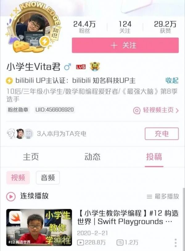 这种低幼化在UP主群体上也有所体现。科技区UP主“小学生Vita君”已经拥有了24.4万粉丝,即使他的视频都是相对硬核一些的编程知识。像Vita君这样的10后 创作者,在B站还有很多。