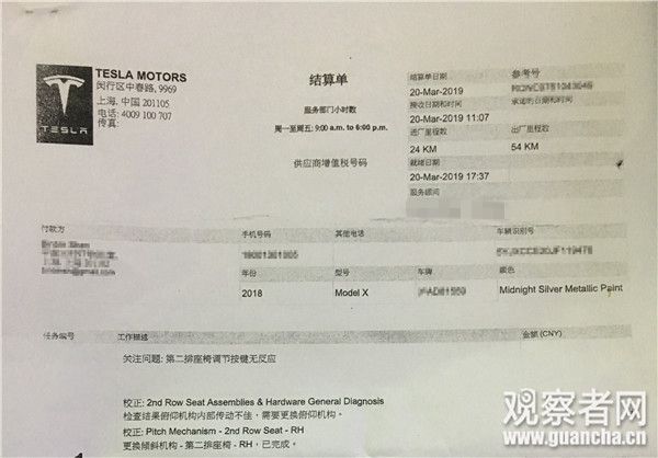 维修单信息显示,N女士买下的Model X展车存在座椅倾斜机构的传动故障