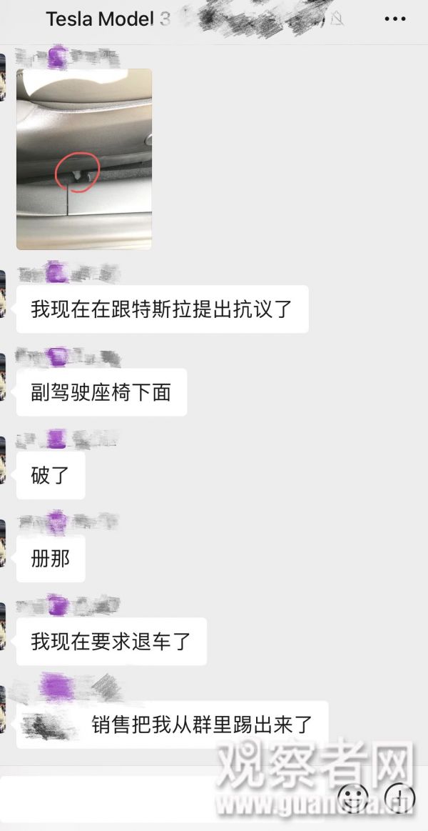 同时,N女士又向观察者网汽车频道提供了一份疑似Model 3上海车友会的群内截图,显示一位车主向特斯拉抗议副驾驶座椅下方破裂,要求退车,结果被特斯拉销售人员强制退群,不过,这一事件尚未得到核实。