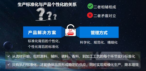 拿红烧肉举例,从选材开始,包括原料、辅料、调料、香料,到加工工艺的每个环节实行标准化。只有执行标准化,才能确保形成稳定的供应,同时实现规模化生产,降本增效。同一个品牌在南方和北方,菜名都是红烧肉,味道却不一样。个性化最重要的是每个店里的要求都不一样。如何解决这样的冲突?最重要的是靠产品解决方案。