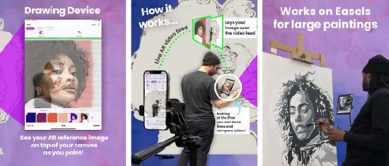 该应用具有独特的双设备系统,可提供多种功能。一台设备用于录制实时 AR 视频源,将图像分层到现实世界中,而另一台设备则由艺术家持有,以便他们可以追踪轮廓并比较颜色。