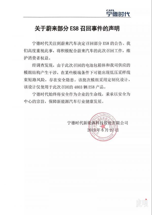 1. 6月27日,宁德时代发布关于蔚来部分ES8召回事件的声明称,已关注到蔚来汽车决定召回部分ES8的公告,公司高度重视此事,将积极配合蔚来汽车的此次召回工作。经调查发现,此次召回的电池包箱体和宁德时代供应的模组结构产生干涉,在某些极端条件下可能出现低压采样线束短路风险,存在安全隐患。该批次模组采用定制化设计,该设计仅使用于此次召回的4803辆ES8产品。