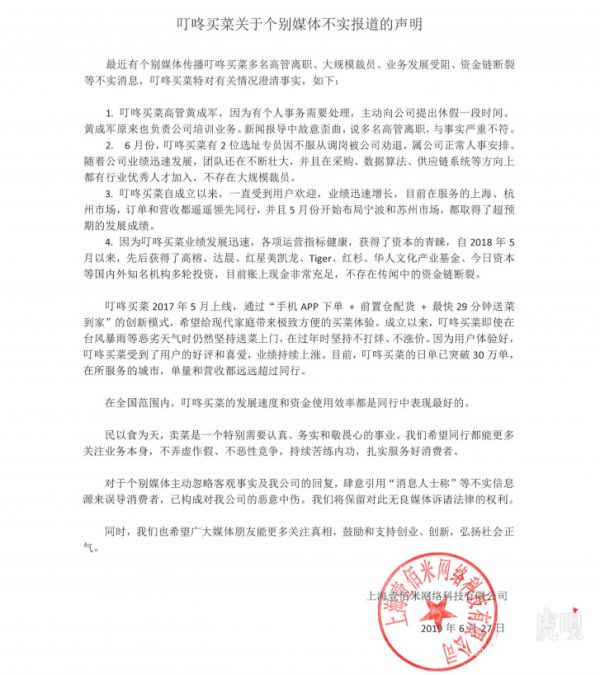 叮咚买菜回应高管离职、裁员消息:不存在的