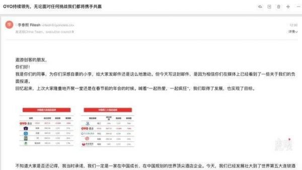 据腾讯一线,OYO创始人RiteshAgarwa(李泰熙)发布了一封中文全员内部信,针对OYO酒店遭遇的负面舆论,李泰熙表示,“负面新闻只能说明:有人成了我们的手下败将,是谁大家心知肚明。”对于烧钱的质疑,李泰熙称,“我们在OYO酒店投入了30亿人民币…...没有一家酒店我们是亏钱的。相反,我们在酒店层面盈利。而且我们资金充足,所以我们明年的目标不是赚钱,而是关注顾客质量和增值。”