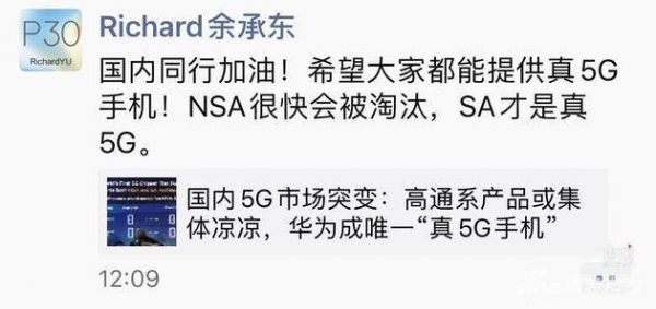 3. 今天中午,华为消费者业务总裁余承东在微信朋友圈转发了相关5G市场文章时表示,5G时代NSA(非独立组网)很快会被淘汰,SA(独立组网)才是真5G。希望大家都能提供真5G手机。