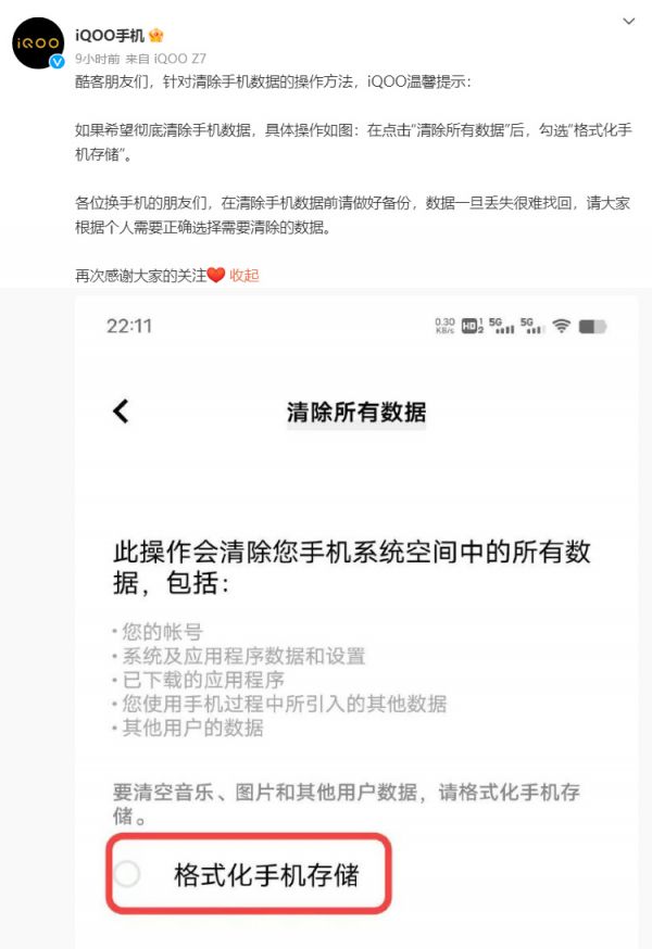 iQOO手机官微发布消息,提醒用户清除手机数据的方法:如果您希望彻底清除手机数据,可以在点击“清除所有数据”后,勾选“格式化手机存储”。这样操作才会彻底删除手机上的数据,请在清除前一定要做好数据备份,防止无法找回重要资料。