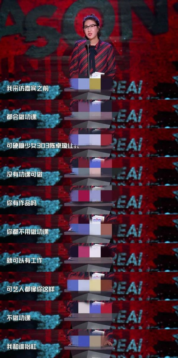 比如调侃流量艺人时,她是这么说的:“我采访嘉宾之前都会做功课,可陈卓璇让我没有功课可做。你有作品吗?歌?电影?诗也行,你有吗?”