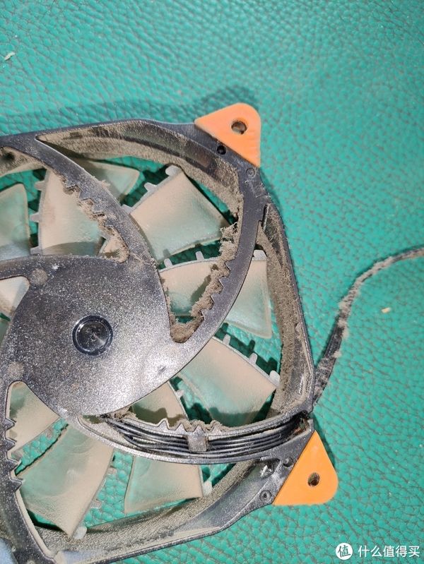 拆机测试了才发现,不是机箱风扇的噪音,是CPU风扇的,而且现在的风扇是没有加油口的,正在我翻来覆去考虑从哪下手的时候,发现了问题所在---风扇翅片裂了。