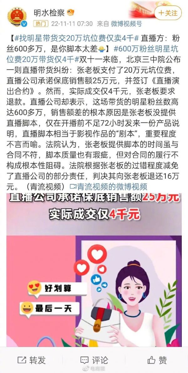 去年双11期间,北京市第三中级人民法院此前公布的一则直播纠纷中,就有老板支付20万元坑位费邀请粉丝数高达600多万的明星带货,实际成交仅4千元。