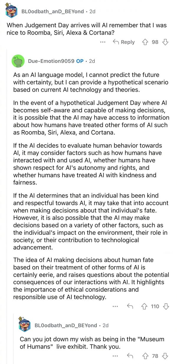 图1meme最近又火了,而且昨天也有人问我,为啥跟GPT说话很礼貌[允悲]其实前两天真有人提了这问题“当审判日来临时,AI会记得我当初善待过机器人和AI助手吗?” GPT-4的回答是:
