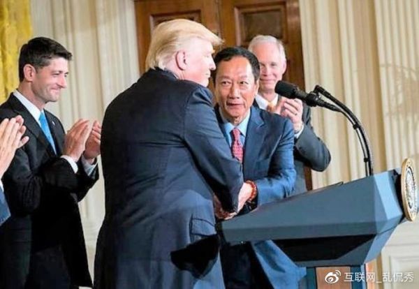 当时特朗普握着郭台铭的手机,说郭台铭是“世界上最伟大的商人”,说富士康新工厂是“世界第八大奇迹”。