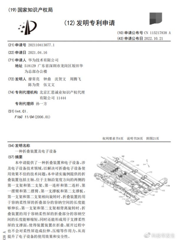 不仅如此,铰链方面似乎也有所升级,华为Mate X3“一种折叠装置及电子设备”的专利提到,为了让手机展开后更平整,原来铰链中冗余的多级机械结构大幅减少,驱动转轴展开的部件改为摆臂连接转动,机身因此可能变得更薄,容屏空间变得更大,展开后折痕更浅。即使机身非常轻薄,丝毫不妨碍折叠屏手机实现平整的屏幕效果。