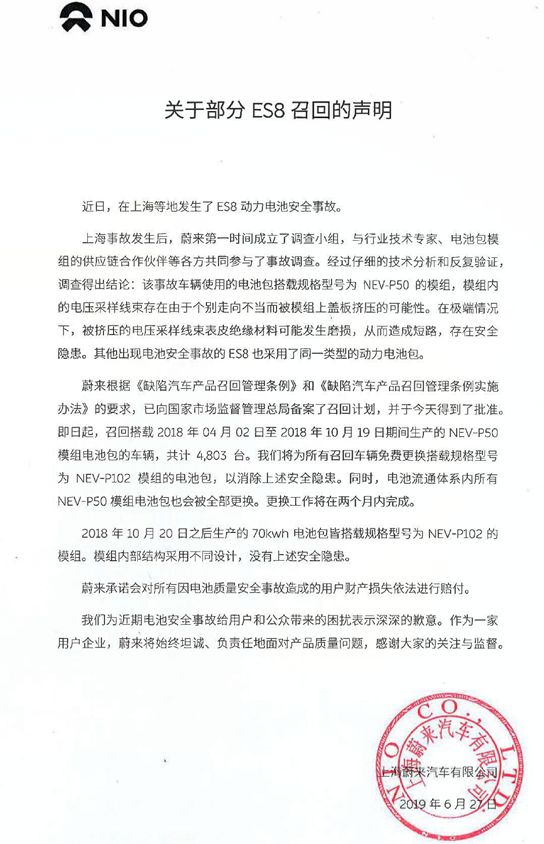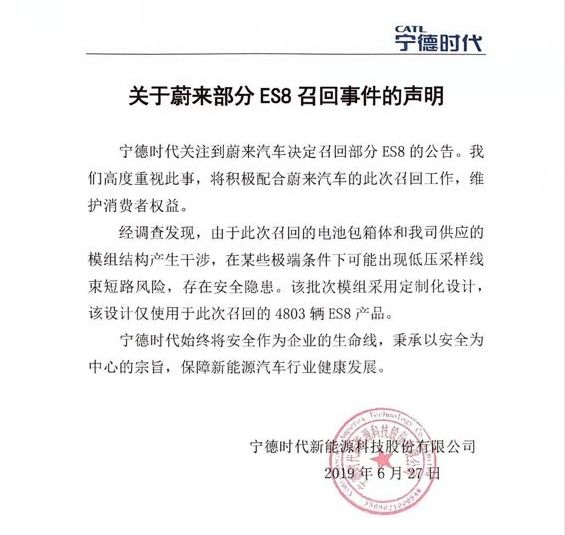 (原标题:蔚来大批召回,宁德时代未“认领”负责)