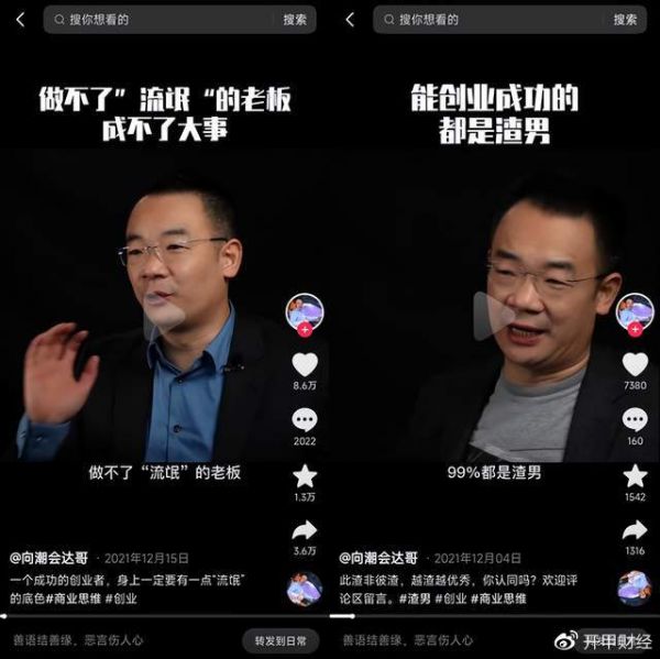 开甲财经注意到,2021年12月,邓达曾在抖音(@向潮会达哥)发布短视频表示:做不了“流氓”的老板成不了大事”;能创业成功的都是渣男。