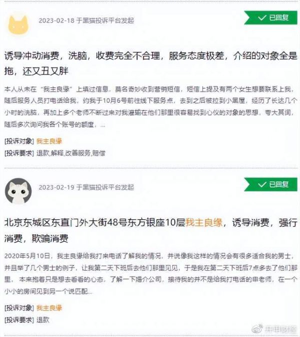 2020年5月,1818黄金眼报道,当年2月份,杨女士通过微信接触到“我主良缘”这个相亲平台,签了一份2880元的合同,见过两位男士。杨女士告诉记者,两个男士对她不满意,一个比她大10岁,一个比她大4岁。