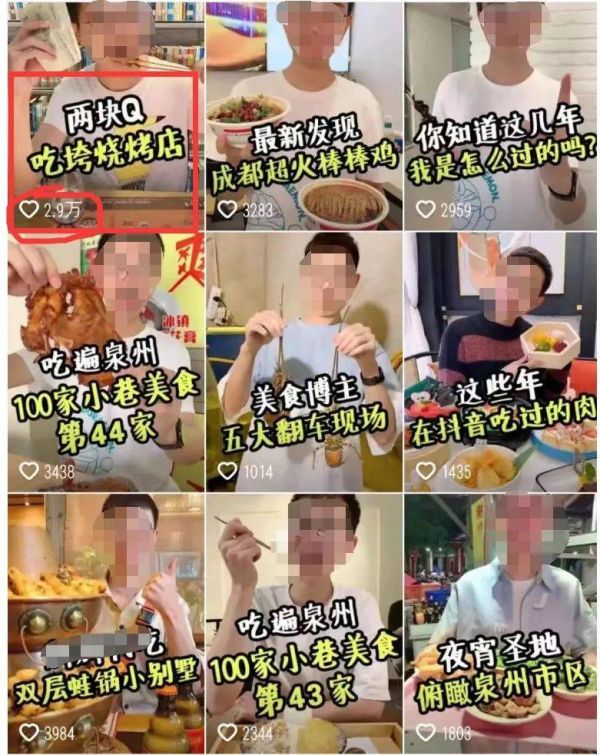 抖音某美食博主视频点赞量对比,“两块Q吃垮烧烤店”的流量明显更高