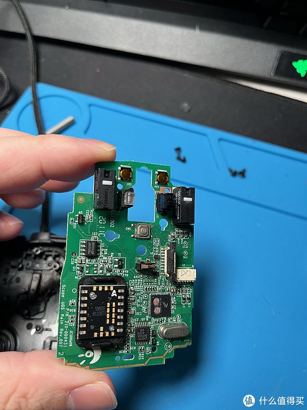 相继拆掉滚轮的三个螺丝钉,和电路板的三个螺丝钉不,再把鼠标排线拆掉,即可得到上图的单电路板