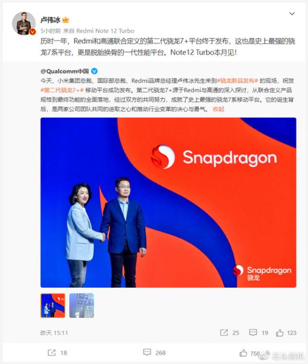 卢伟冰现身高通发布会!Redmi全球首发第二代骁龙7+