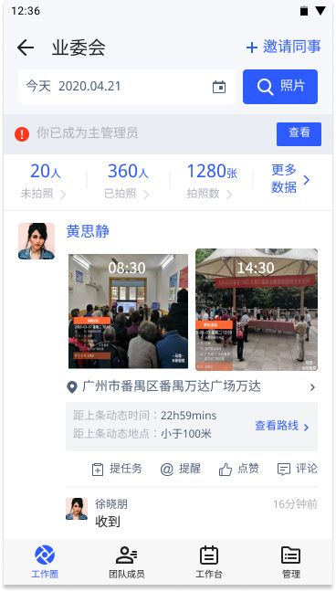 马克水印相机特有的团队工作圈,可用于日常工作照片的上传。照片会实时同步到工作圈,实现即时共享,工作的相关照片就像朋友圈一样展示,显示时间、人名、内容,可查看或下载相应的照片,也可以对某个照片进行评论提出修改意见,更有利于工作的开展和事件的溯源。值得一提的是,工作人员在做工作汇报时往往会把照片分享到微信、工作软件,这样很容易被其它消息刷走,而且翻查很麻烦,马克水印相机特有的团队工作圈可以解决这类问题。