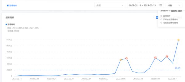 抖音关键词指数显示,“淄博烧烤”在3月5日~3月6日迎来了第一个热度高峰。当时的热门搜索内容有“淄博烧烤为啥火了?”“薛之谦淄博烧烤”等。到了下一个周末,搜索热度又上了一个台阶。