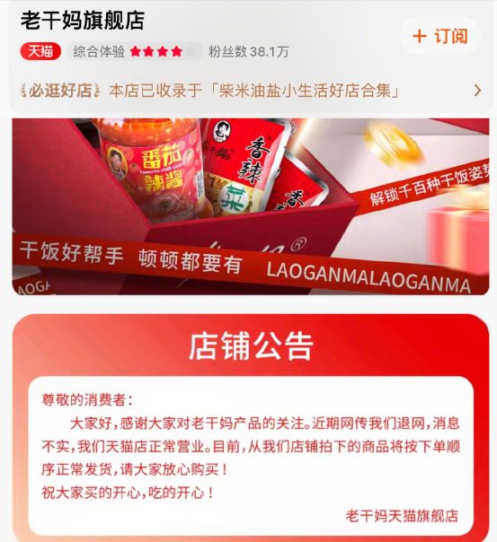 老干妈官宣否认退网:天猫店铺正常营业,消费者可放心